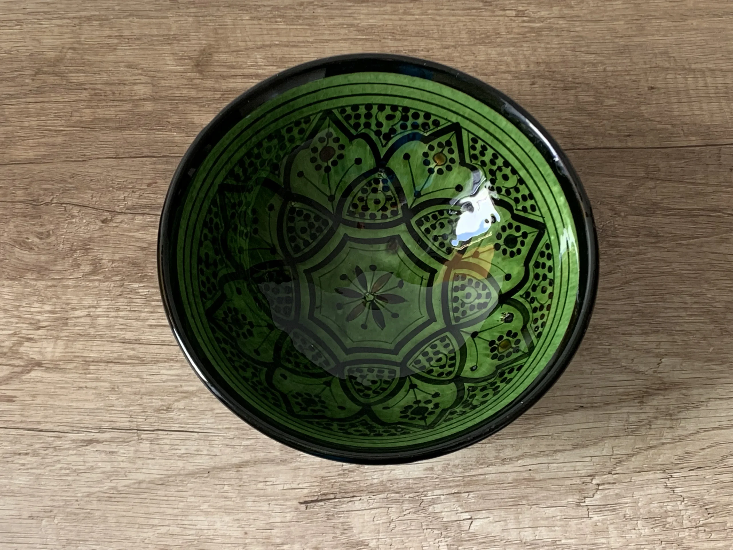 Handmade Moroccan ceramic bowl (25cm) featuring traditional green hand-painted patterns. Perfect for serving salads or as an elegant decorative piece. Crafted by skilled artisans in Safi, Morocco.
