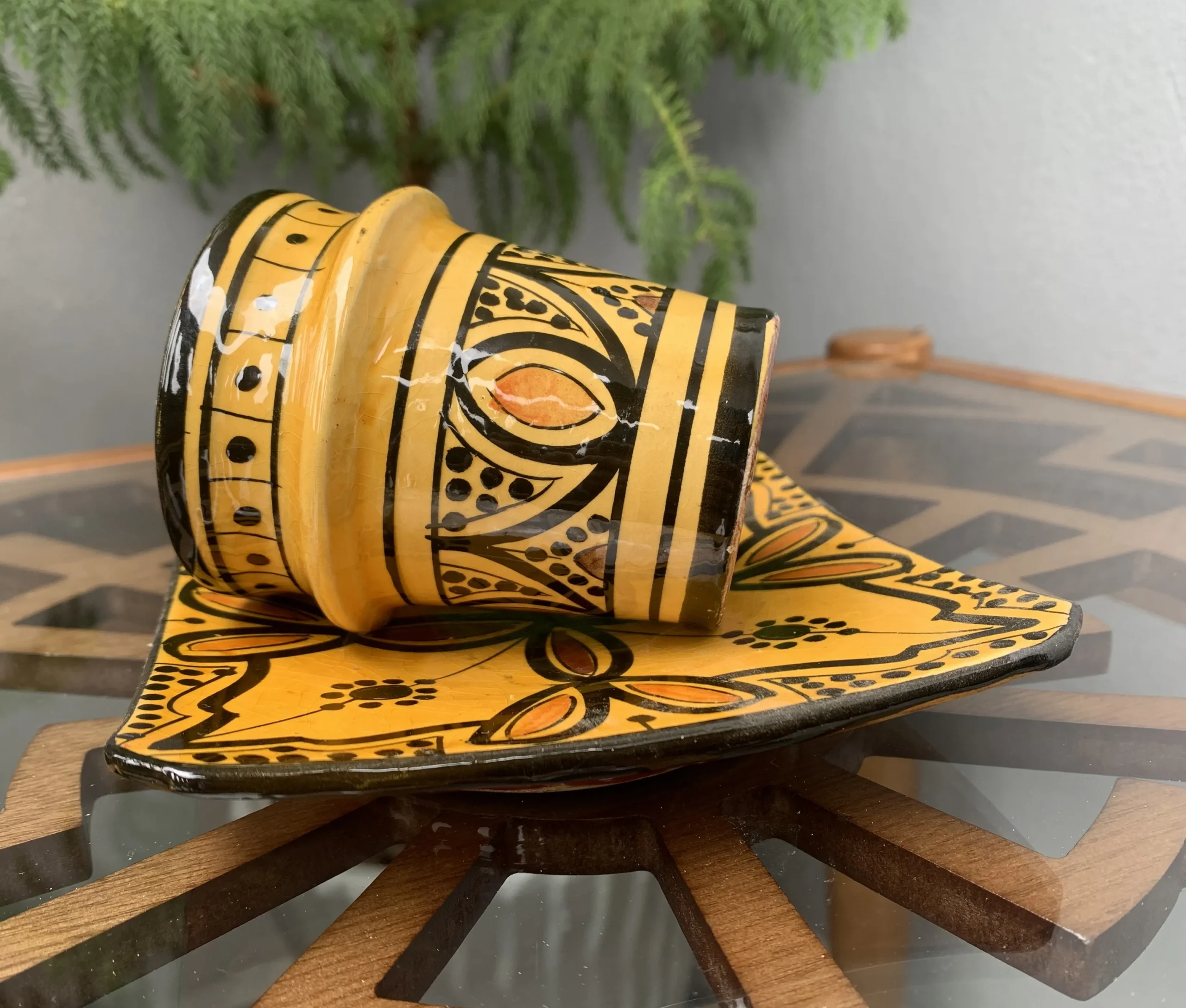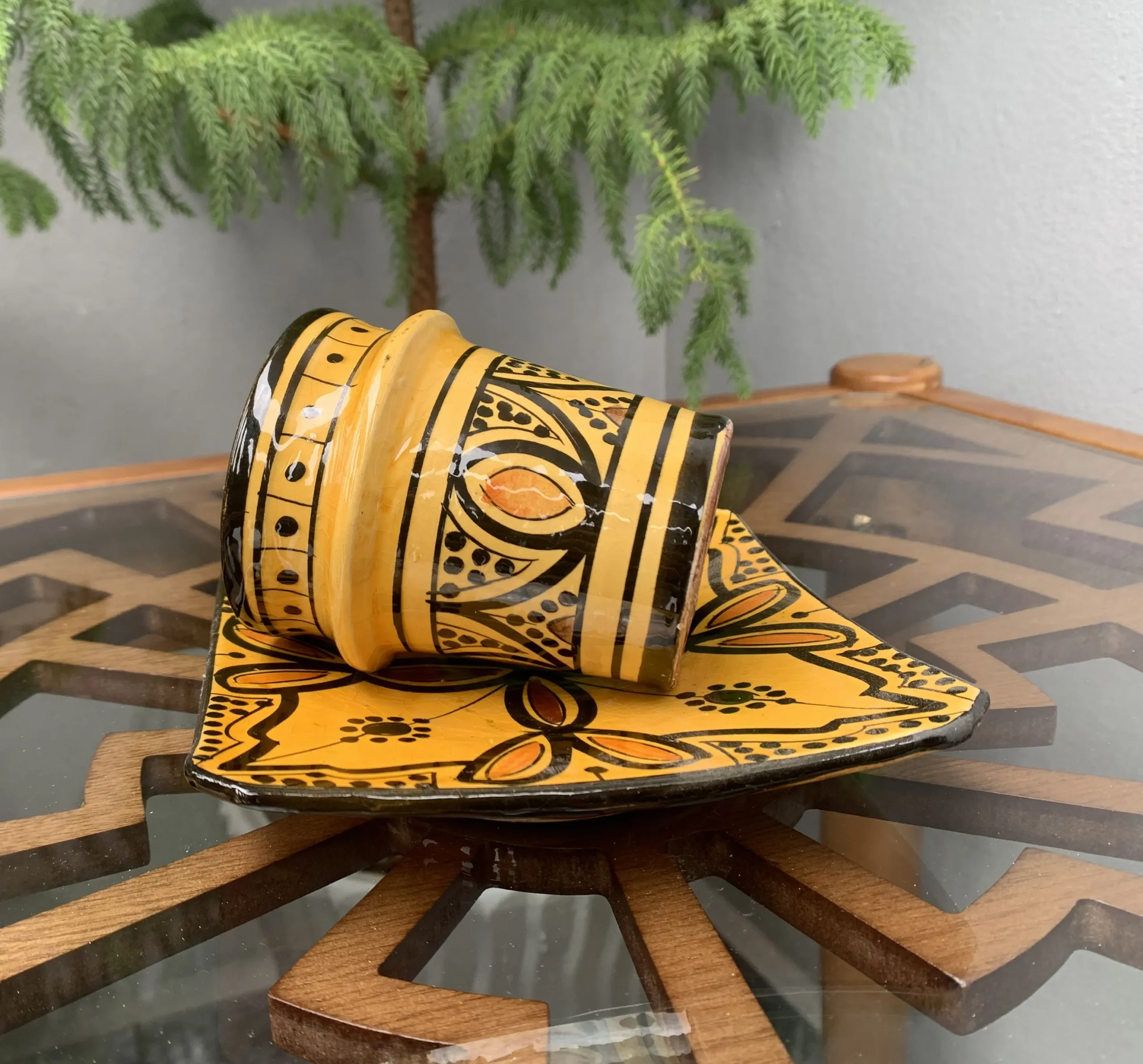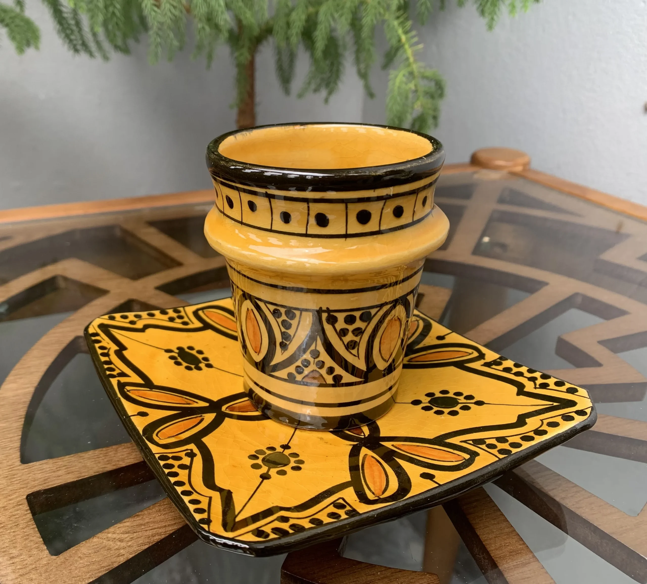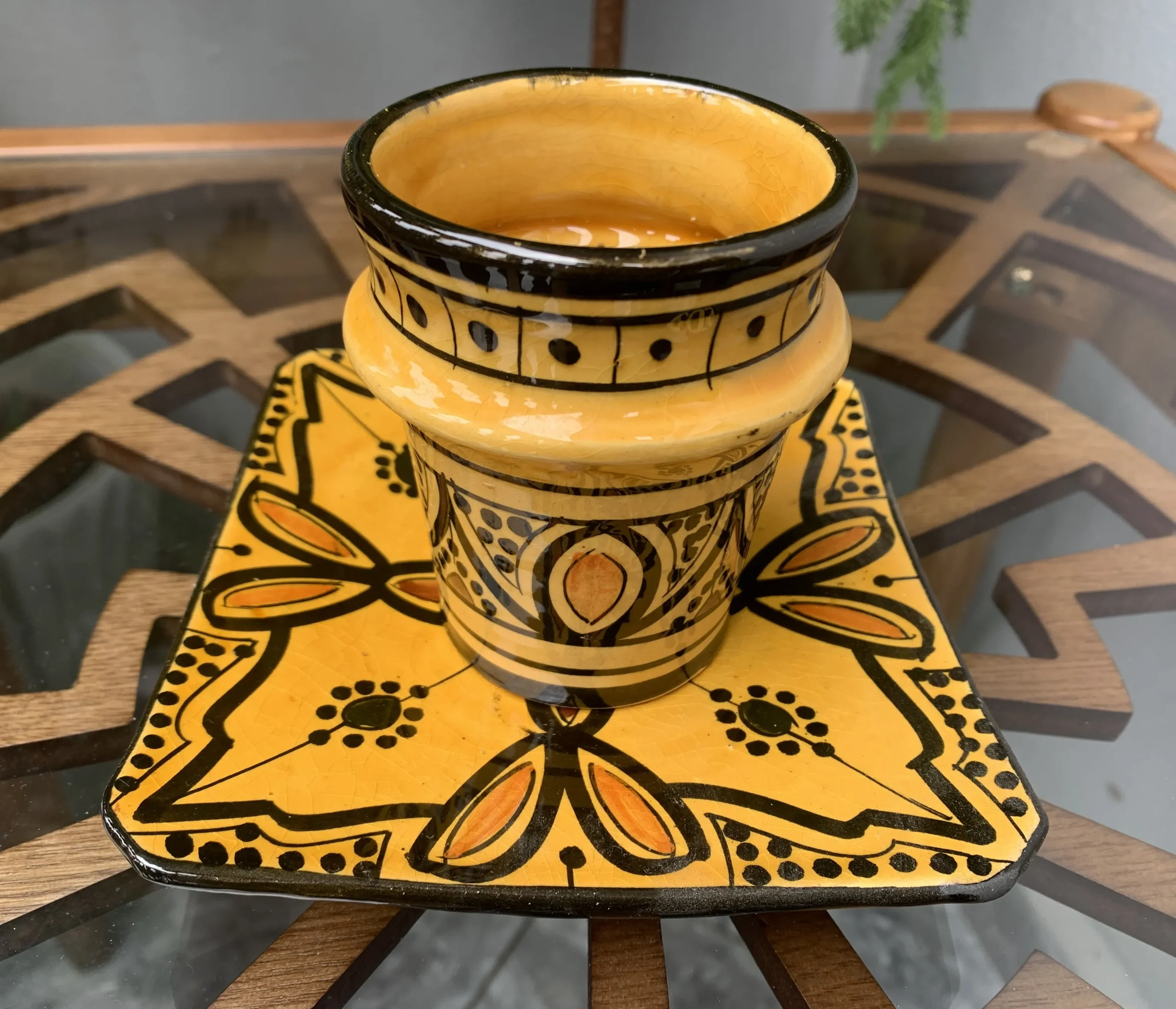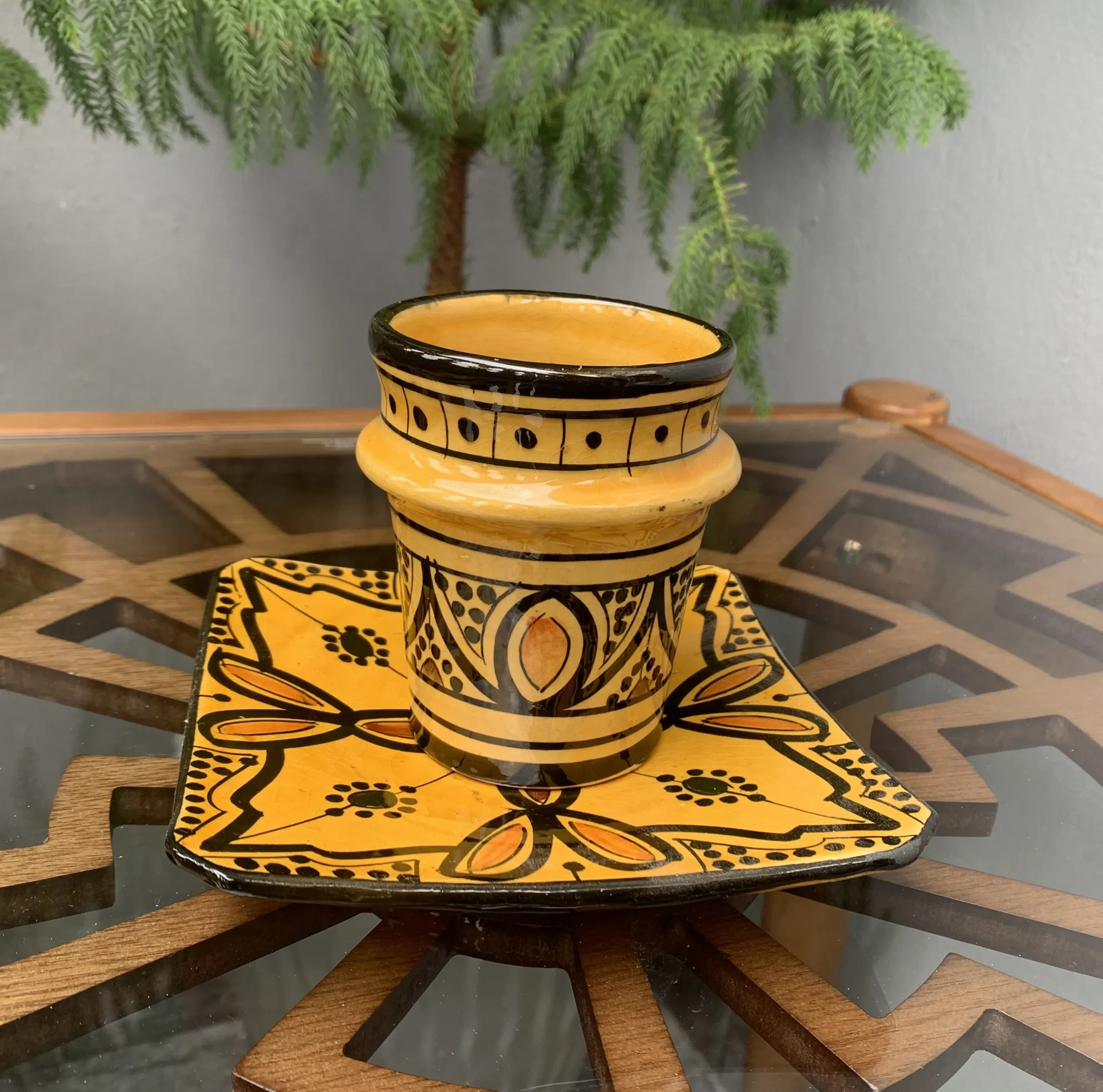 Bring warmth and authentic Moroccan charm to your home with this handmade ceramic coffee cup and matching plate, carefully crafted and hand-painted by skilled artisans in Safi, Morocco—the historic heart of Moroccan pottery.