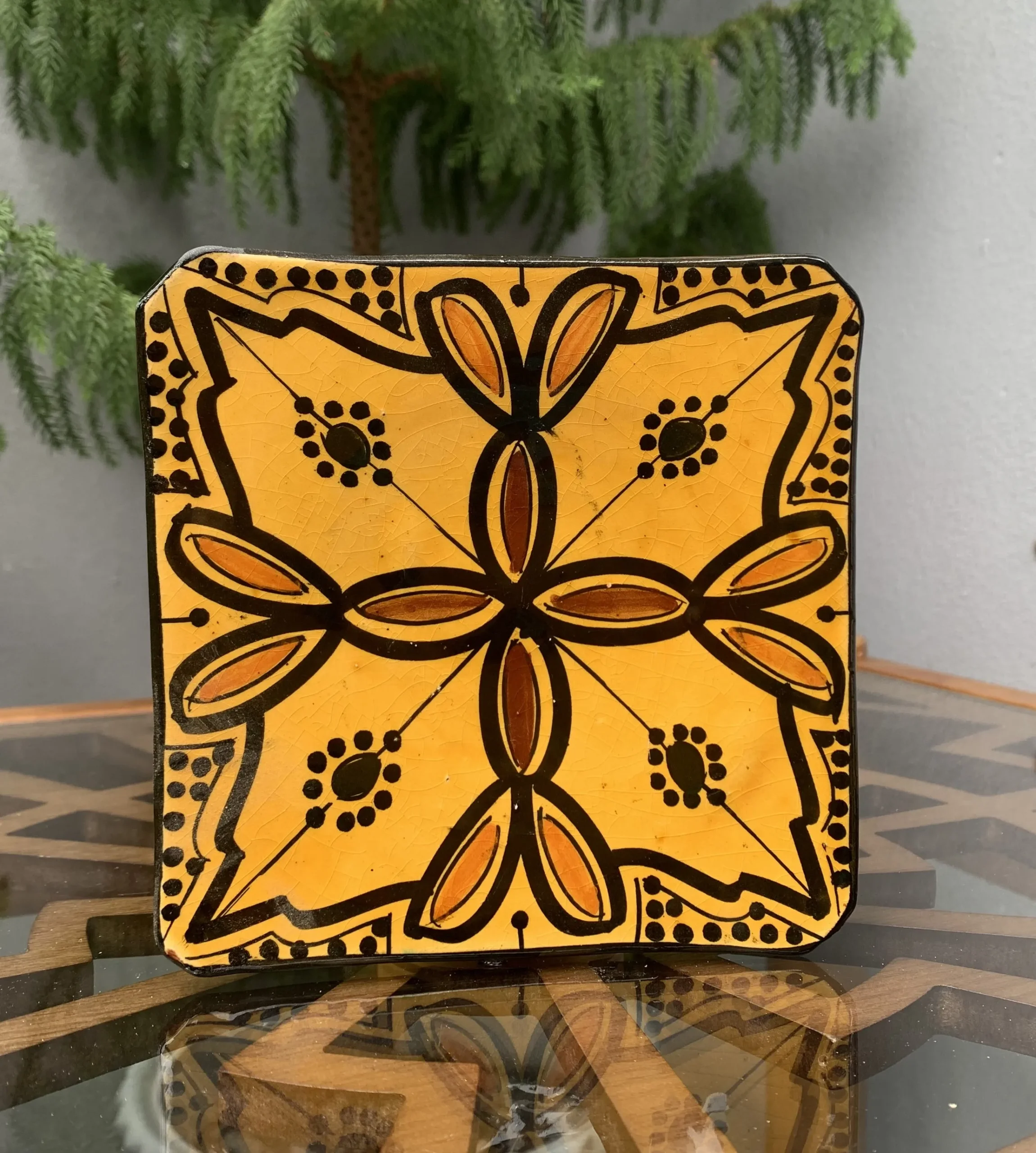 This vibrant yellow design features traditional Moroccan geometric and floral motifs in black and earthy tones, reflecting centuries of artistic heritage. The rich color palette and glossy glaze create a bold yet elegant piece that instantly elevates any table setting.