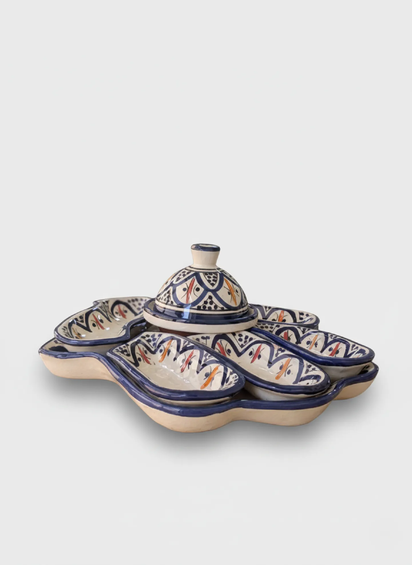 Bring the charm of Moroccan craftsmanship to your home with this hand-painted Khmissa-shaped ceramic serving set, carefully handcrafted by skilled artisans in Safi, Morocco—the historic heart of Moroccan pottery.