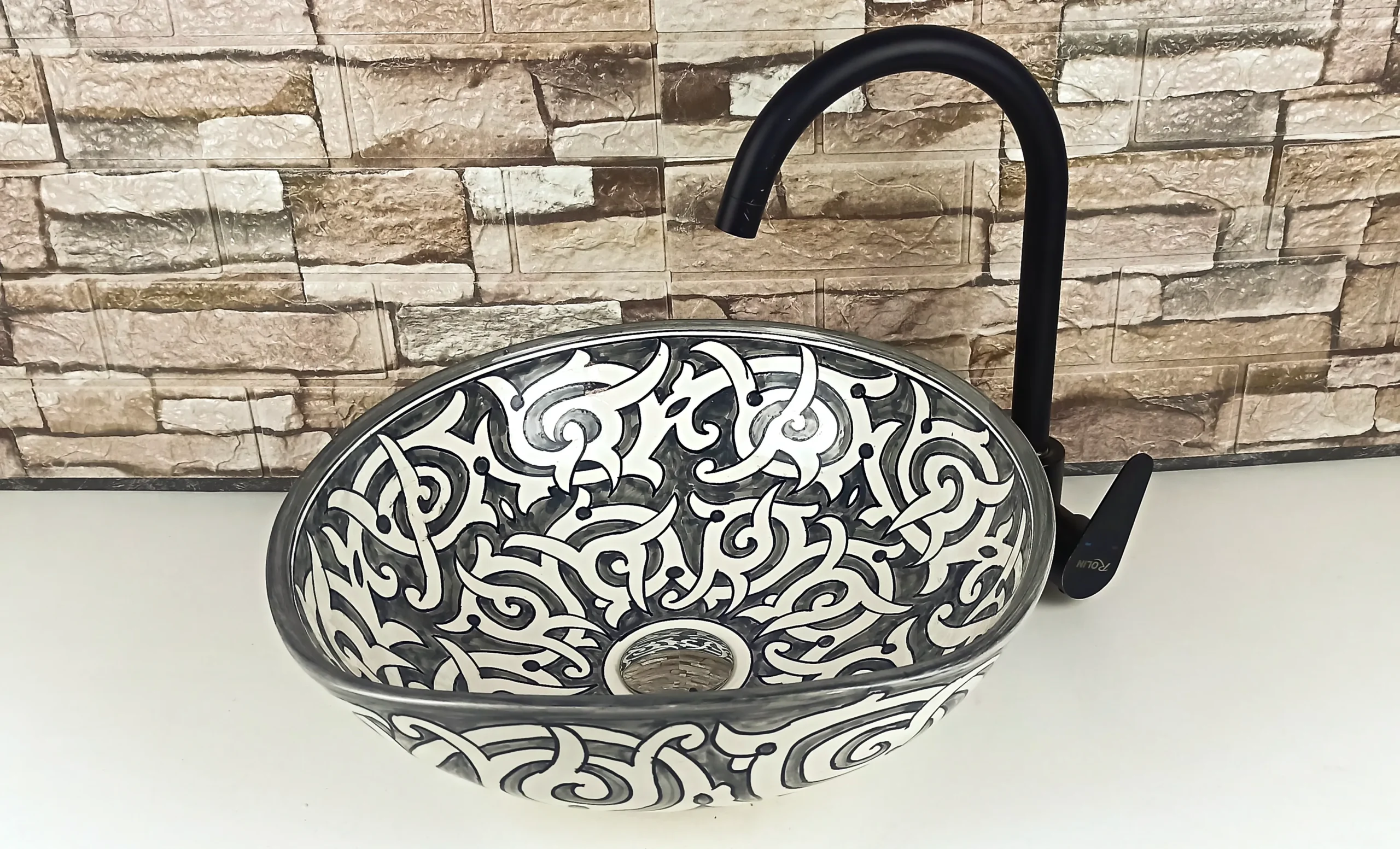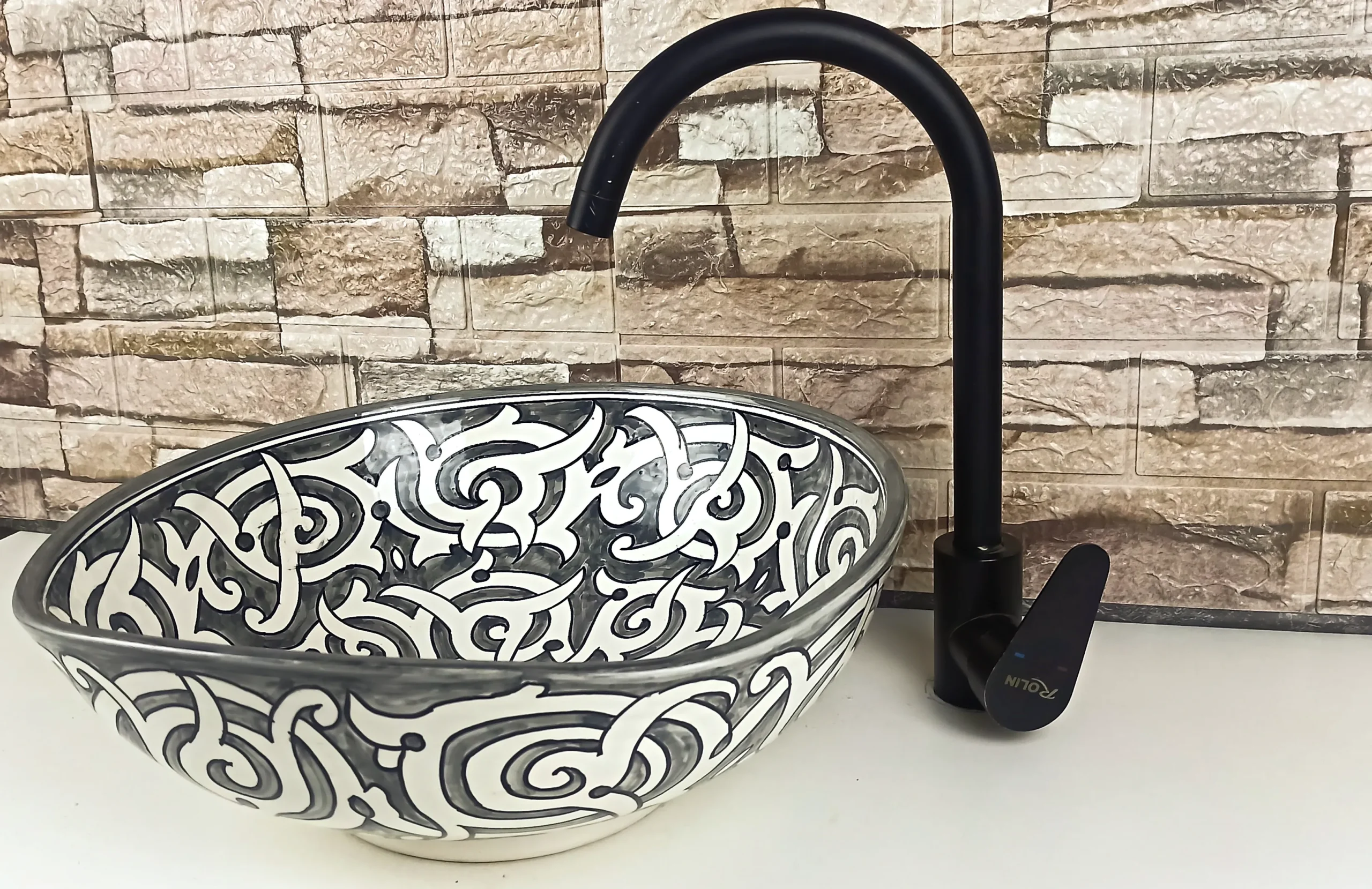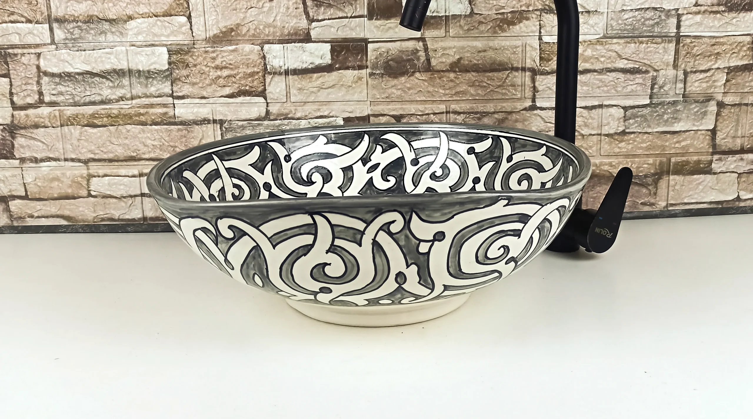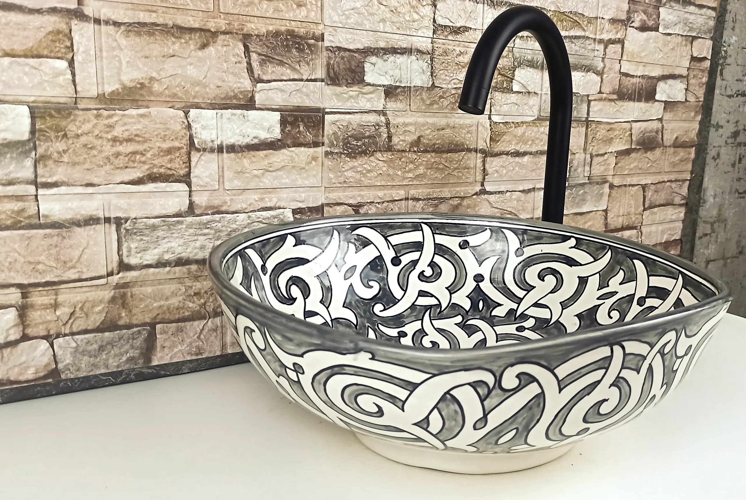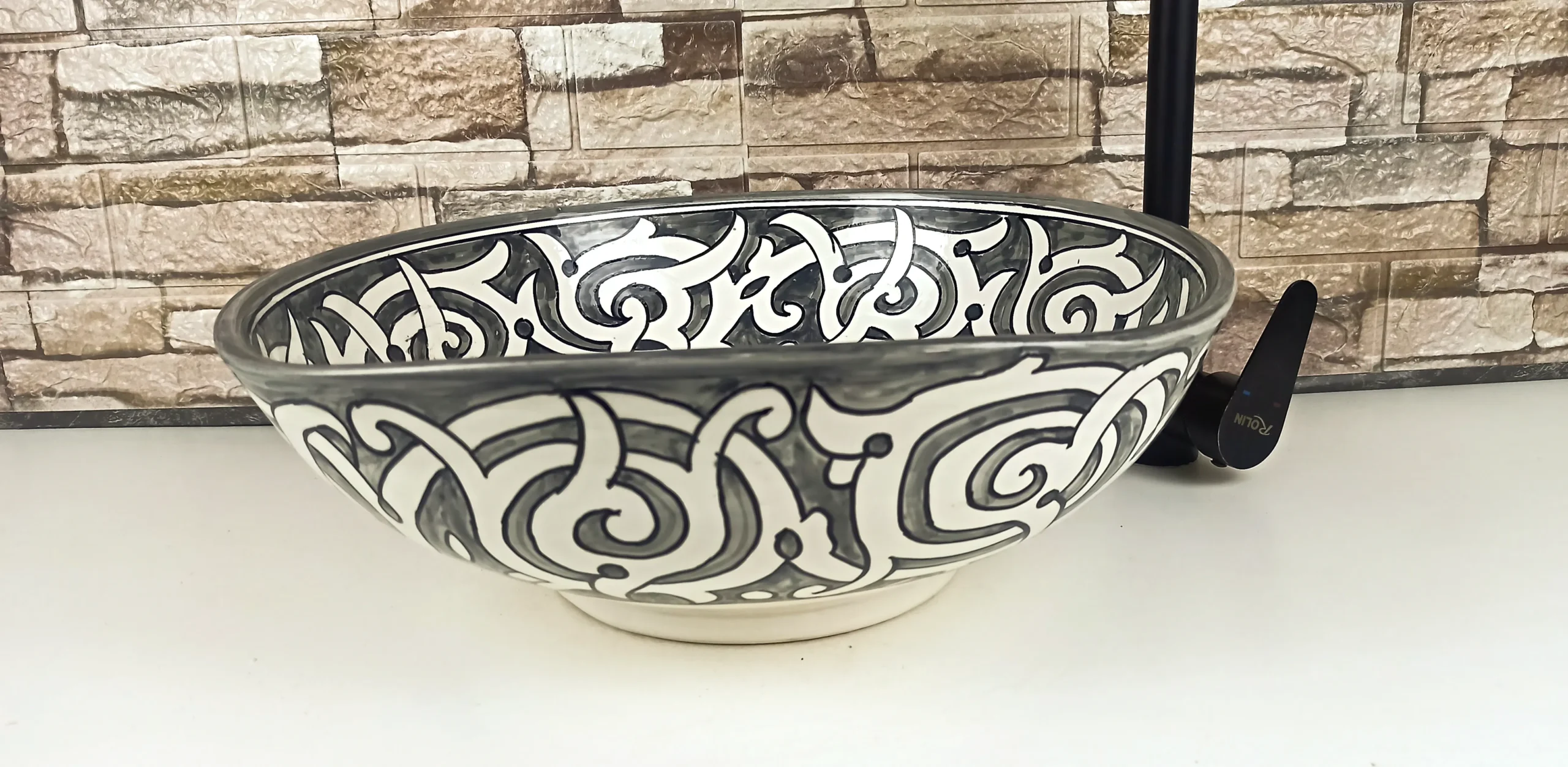 This Moroccan handmade ceramic sink is an authentic artisan vessel basin, carefully hand-painted by skilled craftsmen in Morocco. Designed for bathroom or kitchen countertops, it combines traditional Moroccan artistry with a timeless black and white color palette, making it both elegant and versatile.