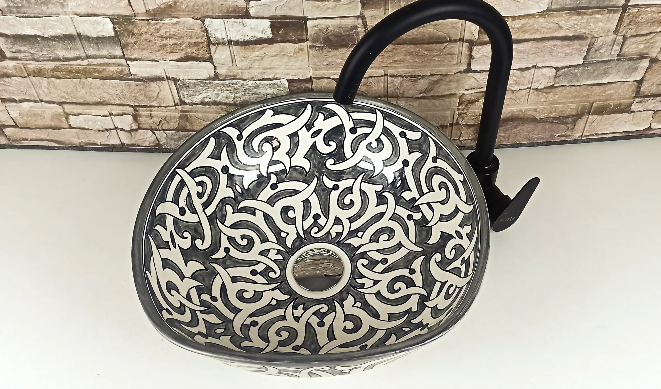 Featuring an intricate arabesque-inspired pattern with flowing curves and balanced symmetry, this ceramic sink adds a refined artistic touch while maintaining a clean and modern aesthetic. Each sink is individually crafted and glazed, ensuring durability, easy maintenance, and a smooth glossy finish.