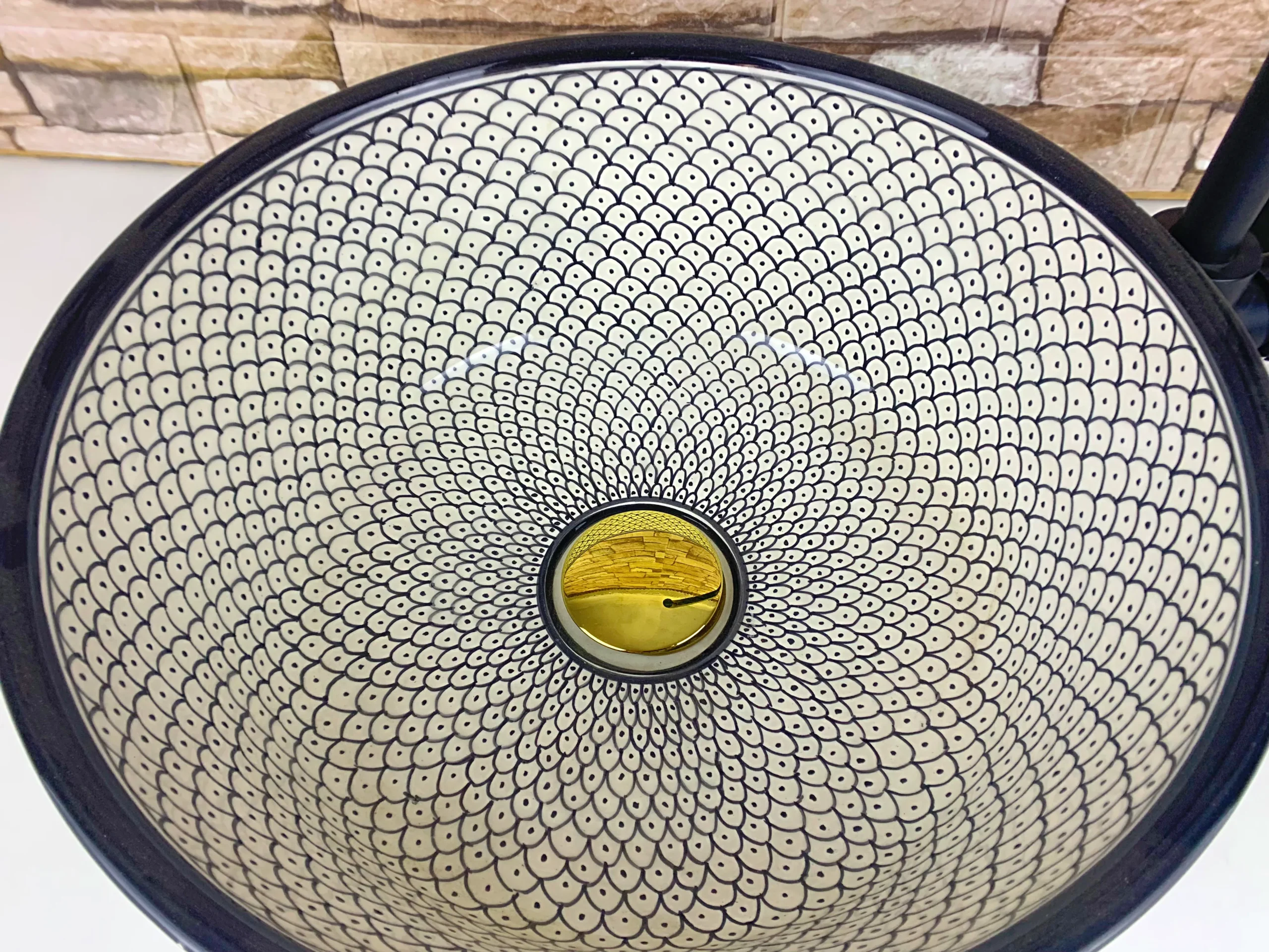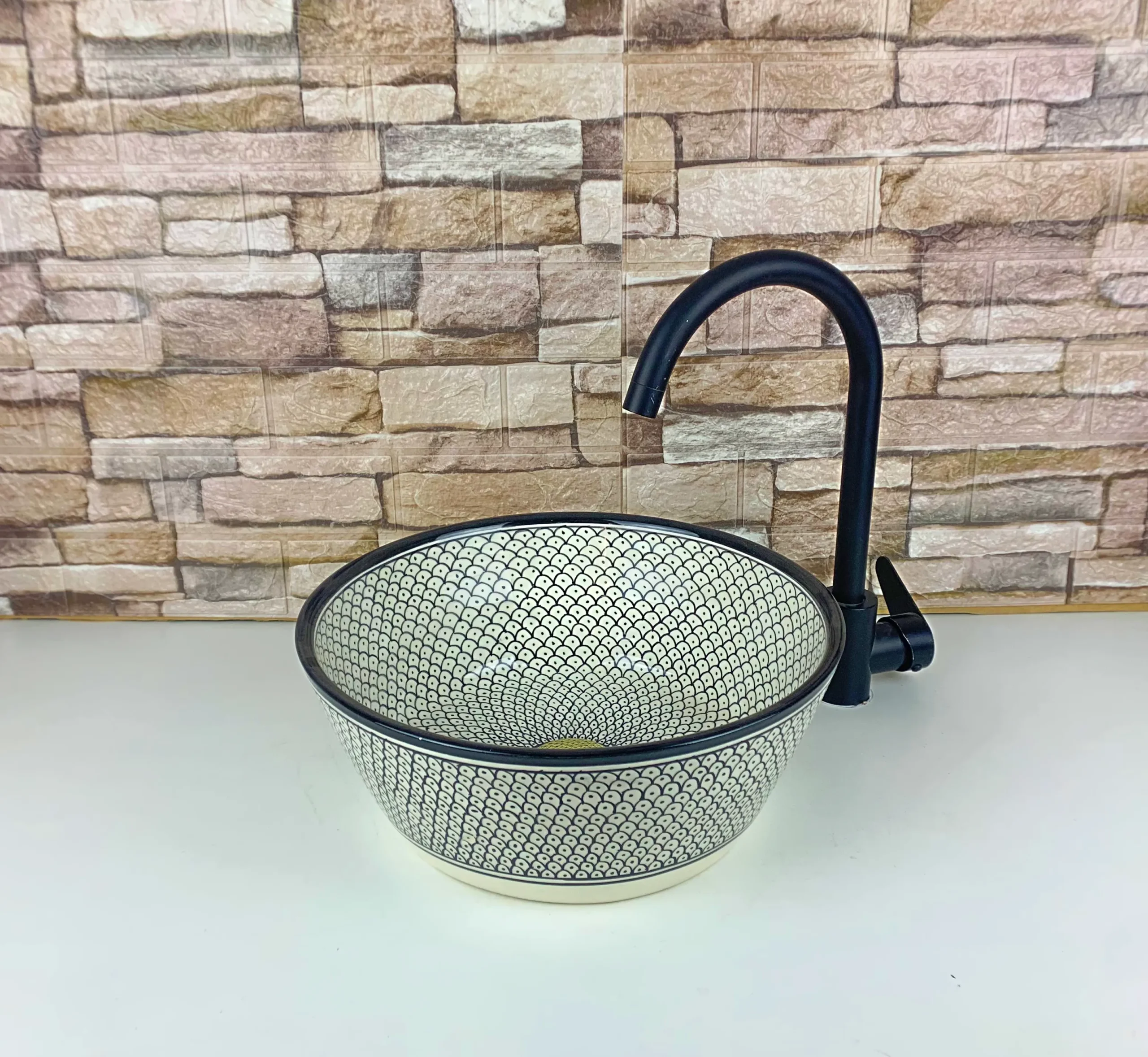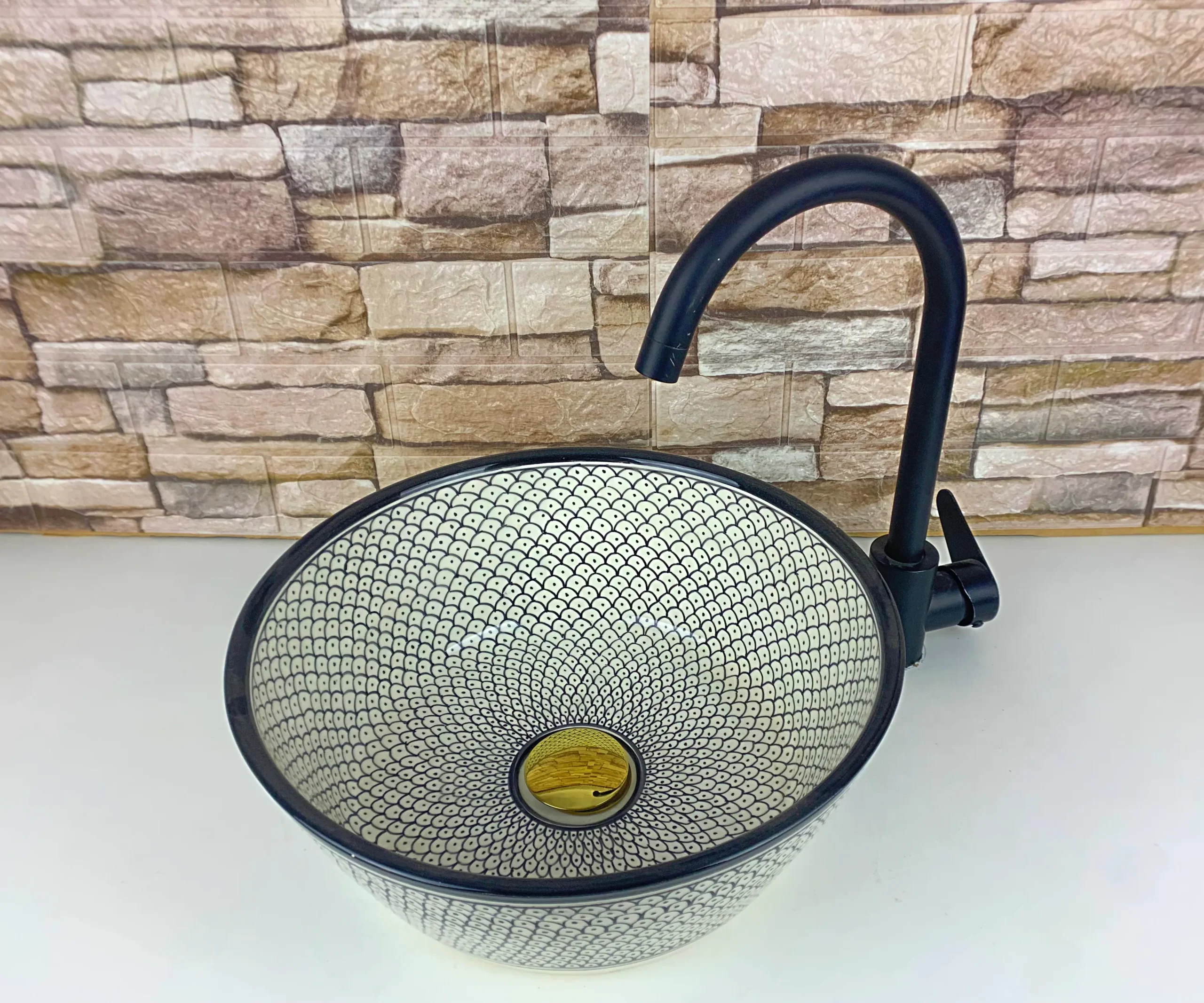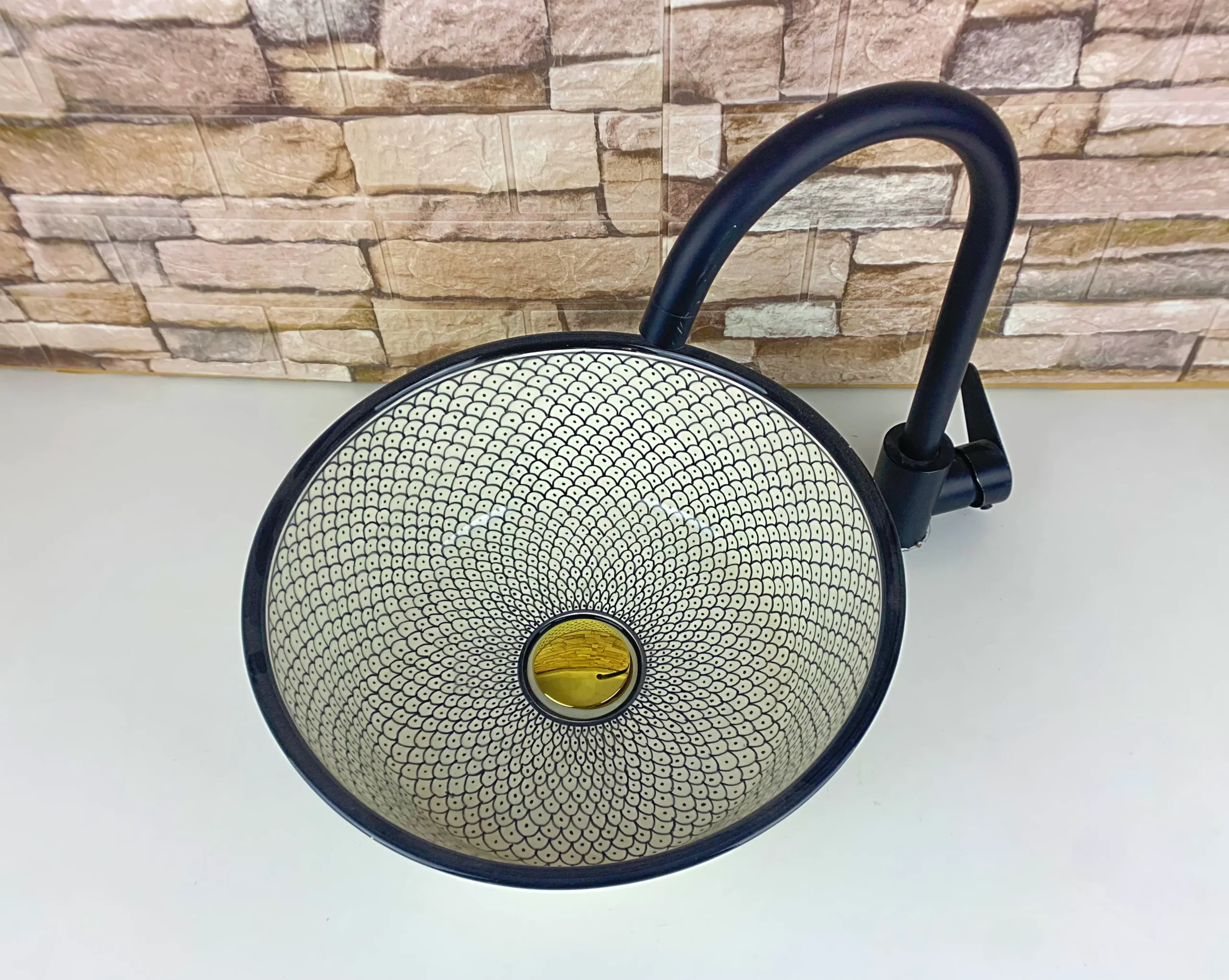 Featuring a refined black and white mandala-inspired pattern with delicate repeating details, this ceramic sink brings balance, harmony, and sophistication to any bathroom or kitchen space. The glossy glazed finish enhances durability, ensures easy cleaning, and highlights the precision of the hand-painted design.
