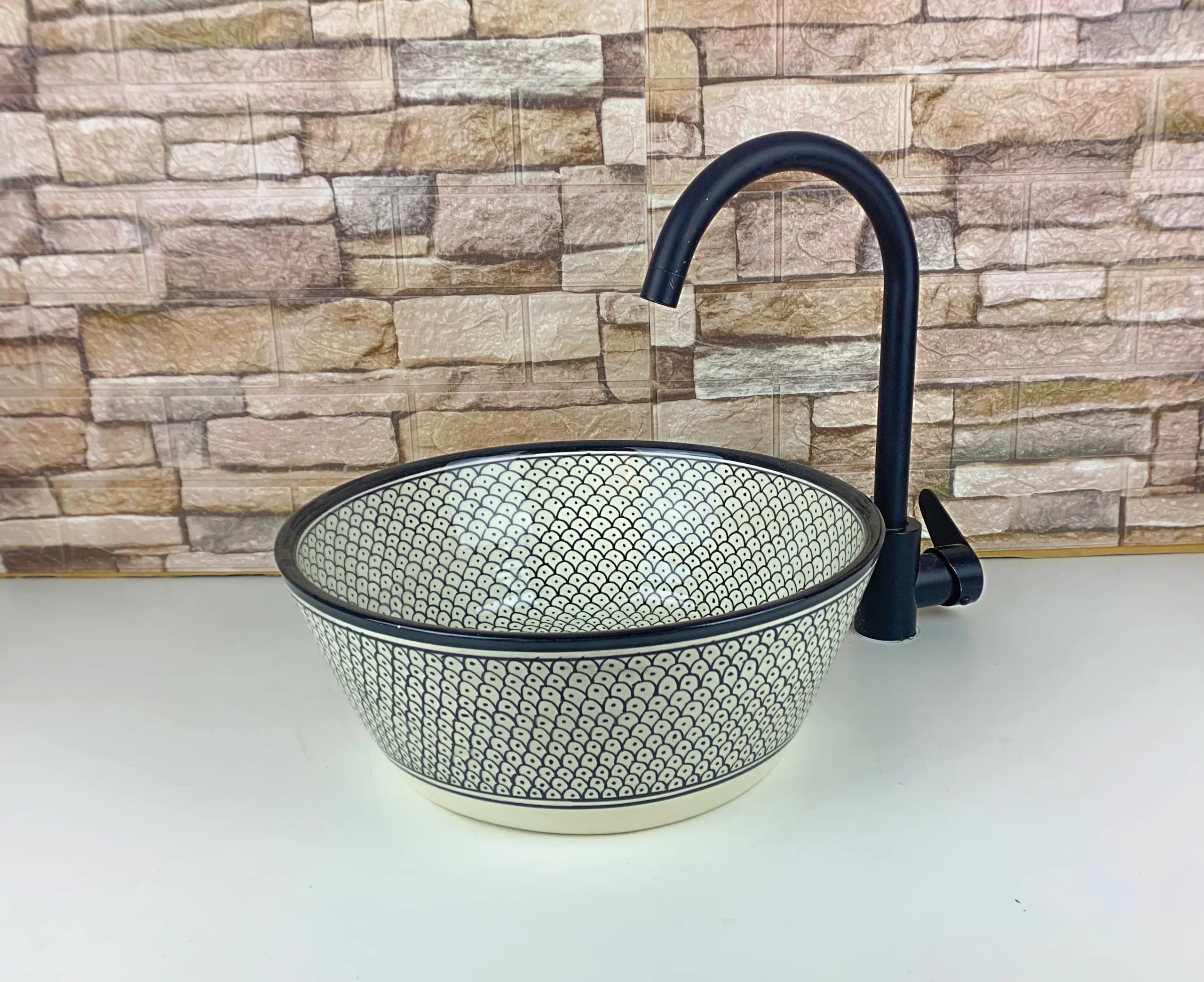 This Moroccan handmade ceramic sink is an elegant artisan vessel basin, carefully hand-painted by skilled craftsmen in Morocco. Designed for countertop installation, it combines timeless Moroccan artistry with a clean, modern aesthetic, making it both functional and decorative.