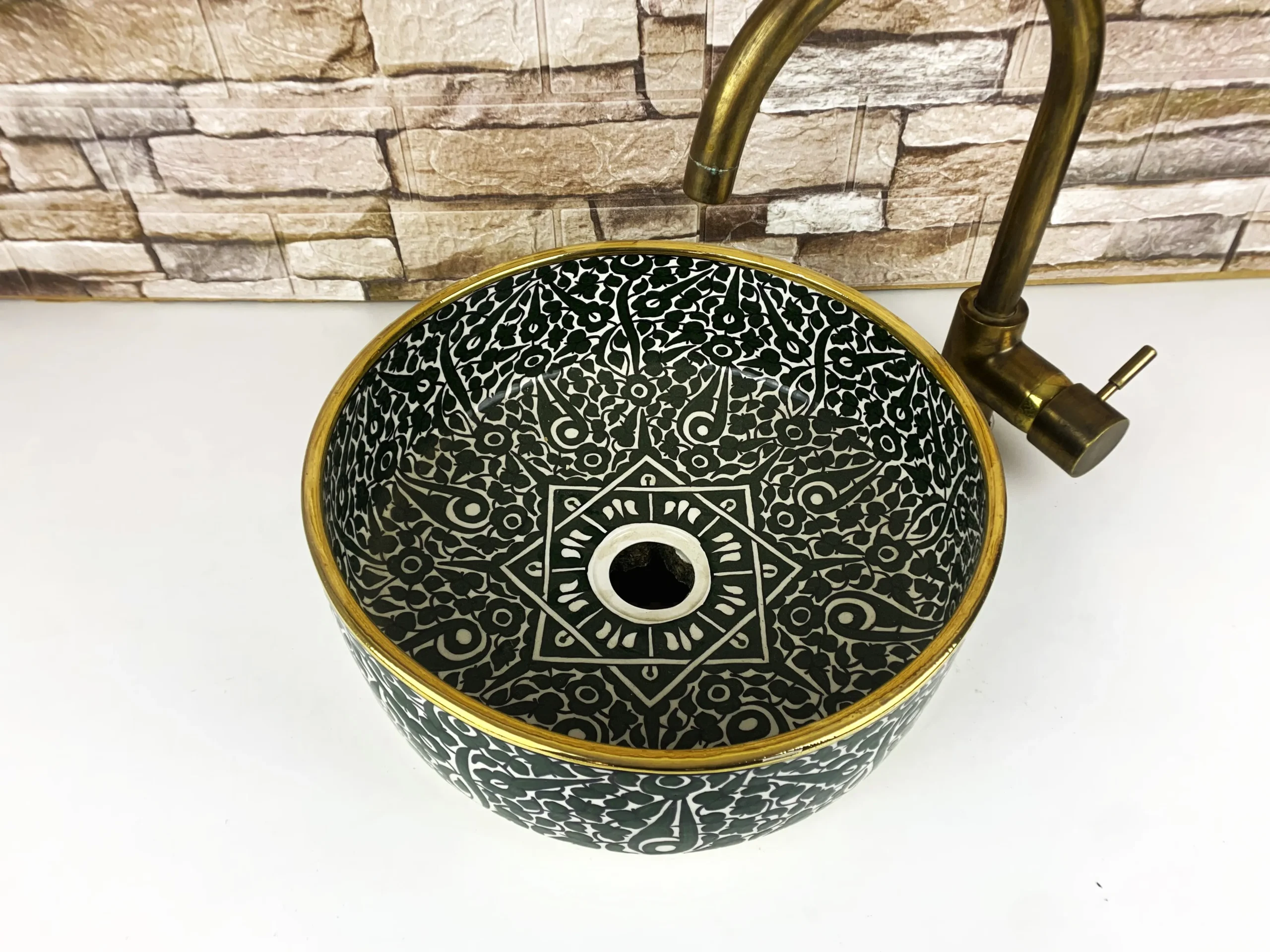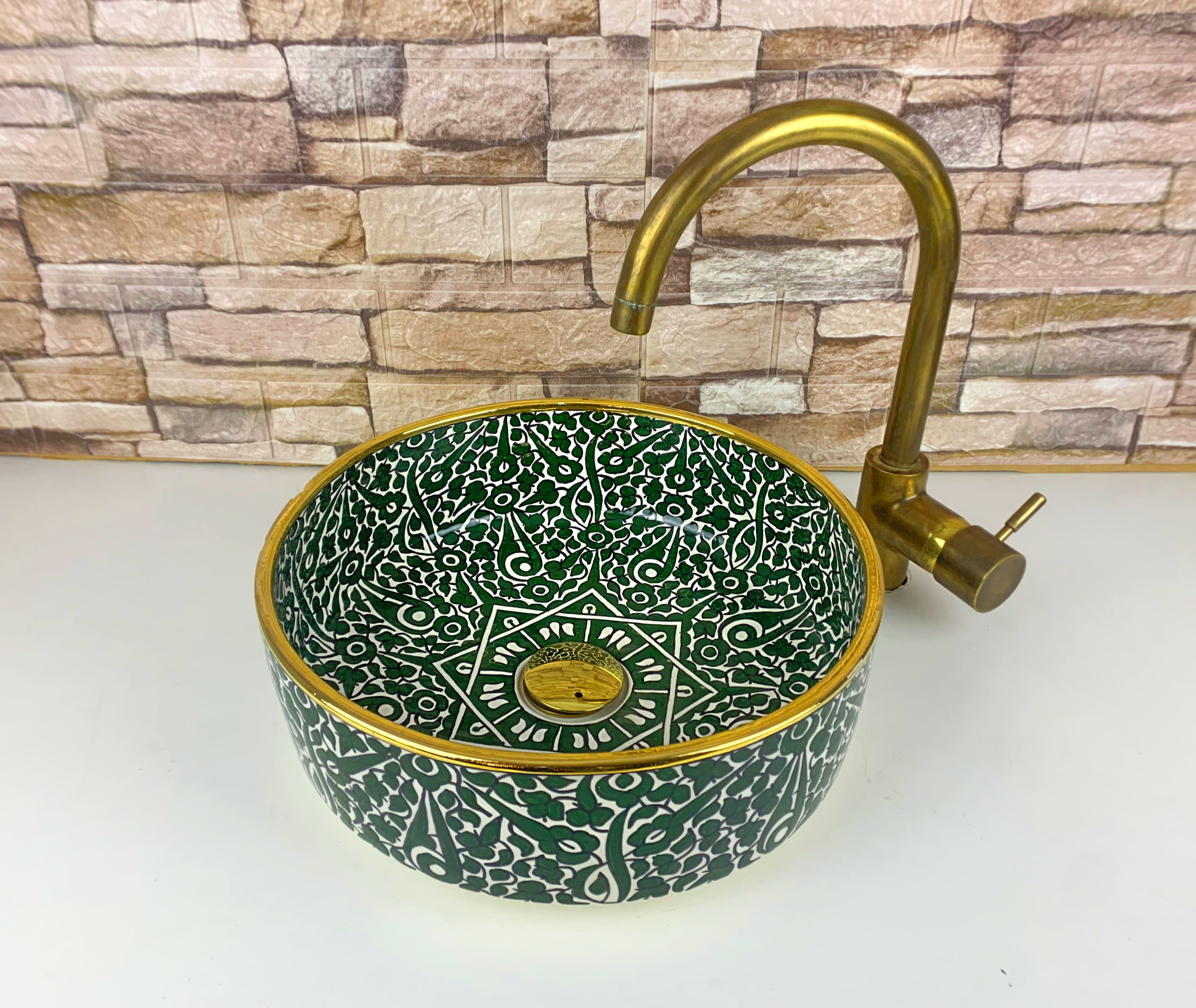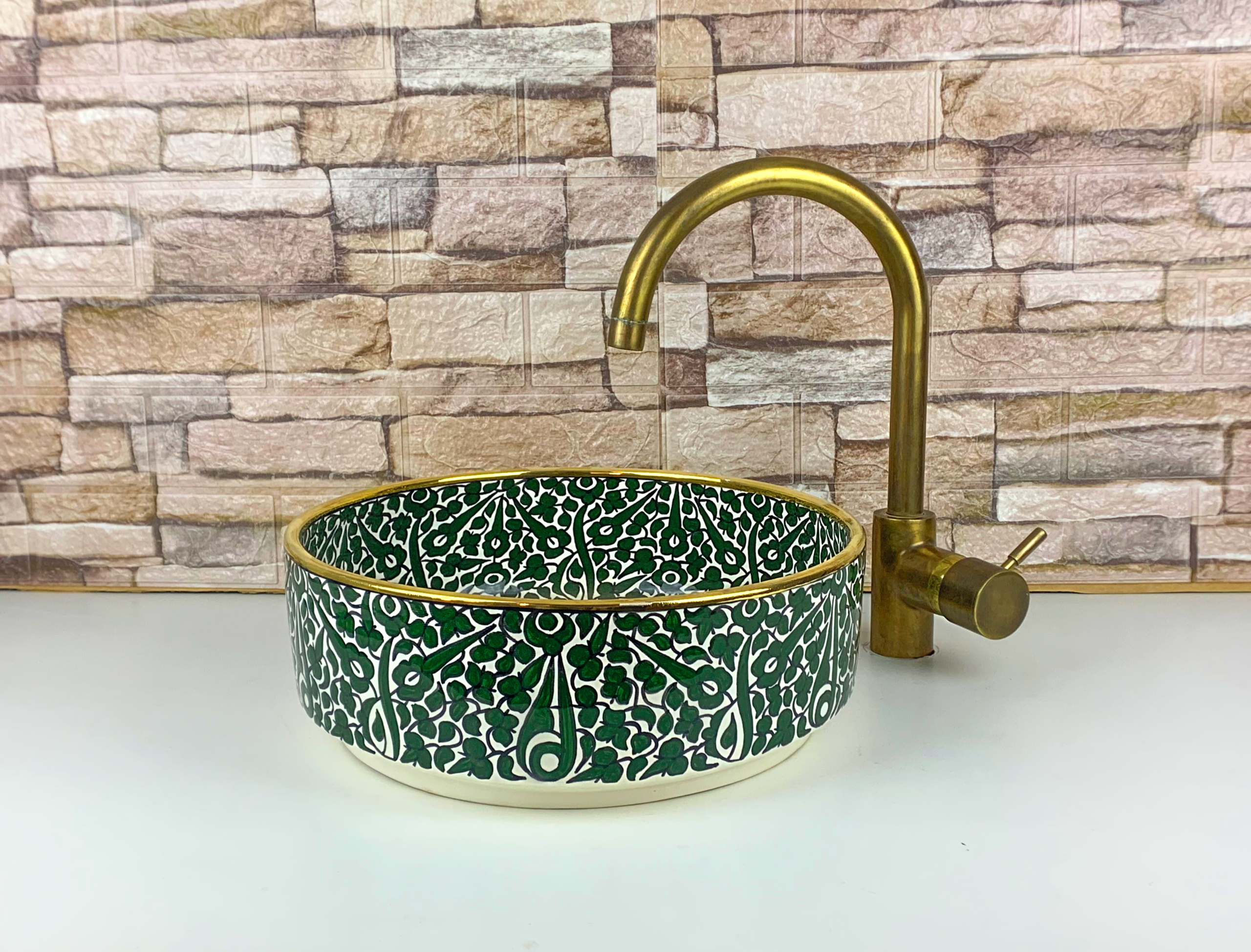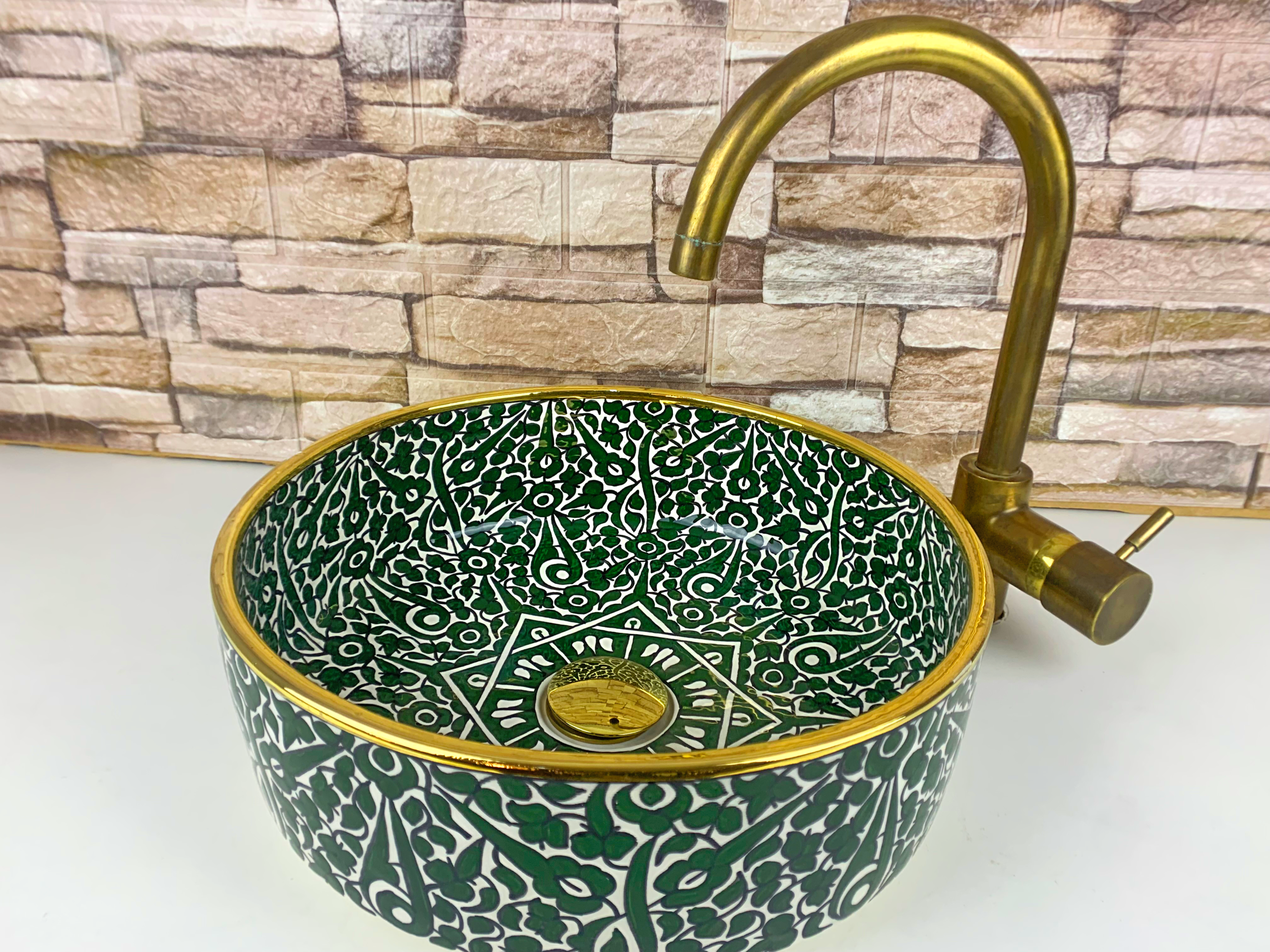 Featuring a rich deep green floral pattern with intricate hand-drawn details, this ceramic sink creates a luxurious and organic atmosphere. The dense botanical motifs and central geometric accent give the basin a strong visual presence while maintaining balance and harmony. Each piece is individually crafted and glazed, offering durability, easy cleaning, and a smooth glossy finish.