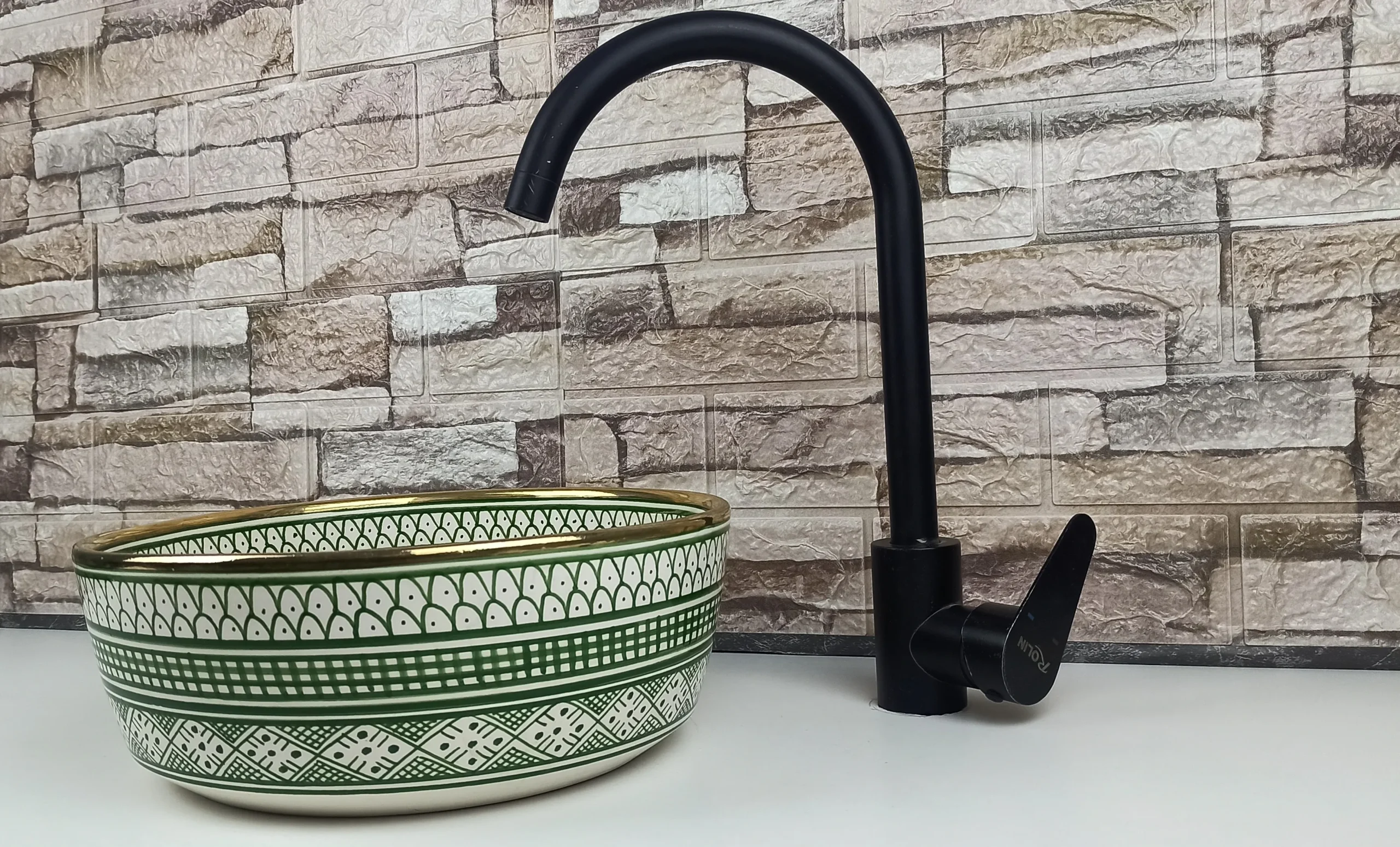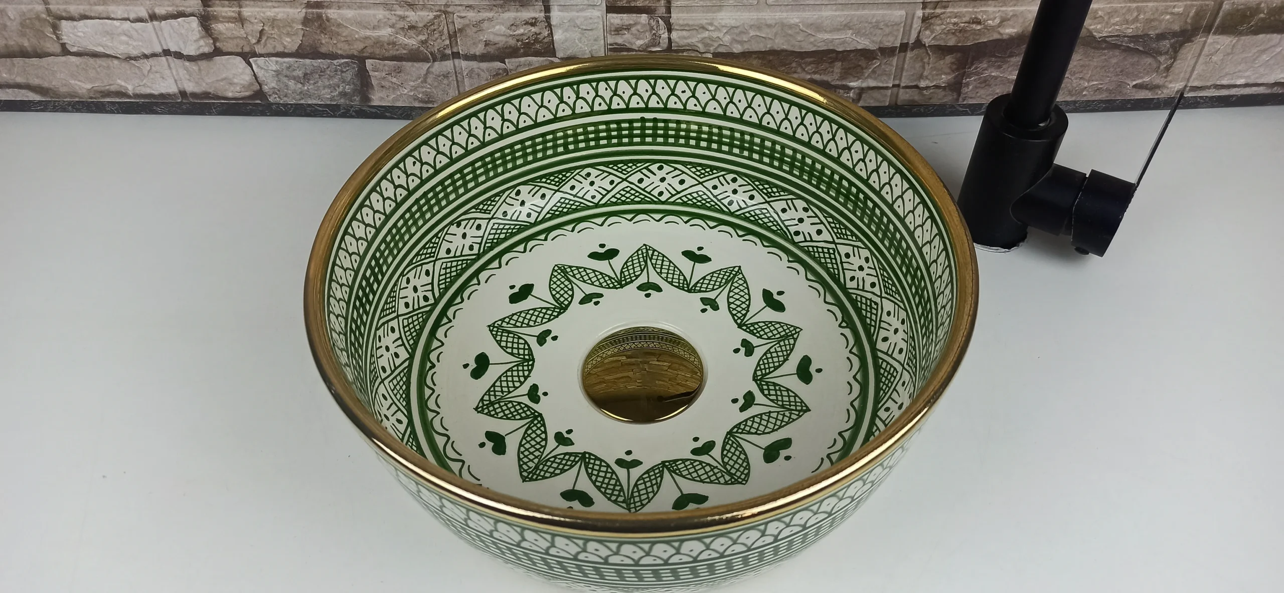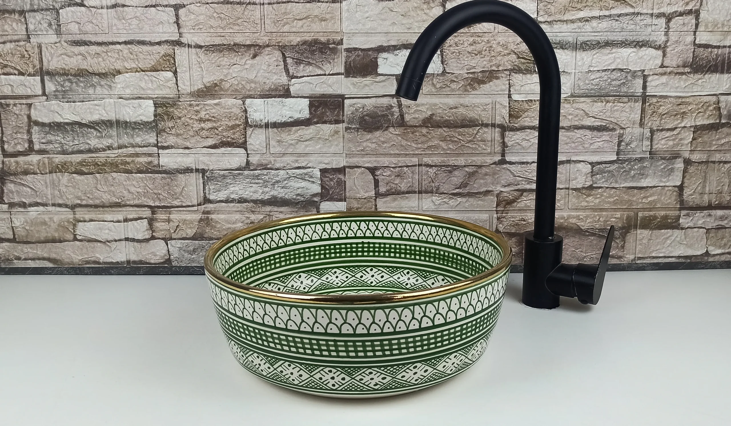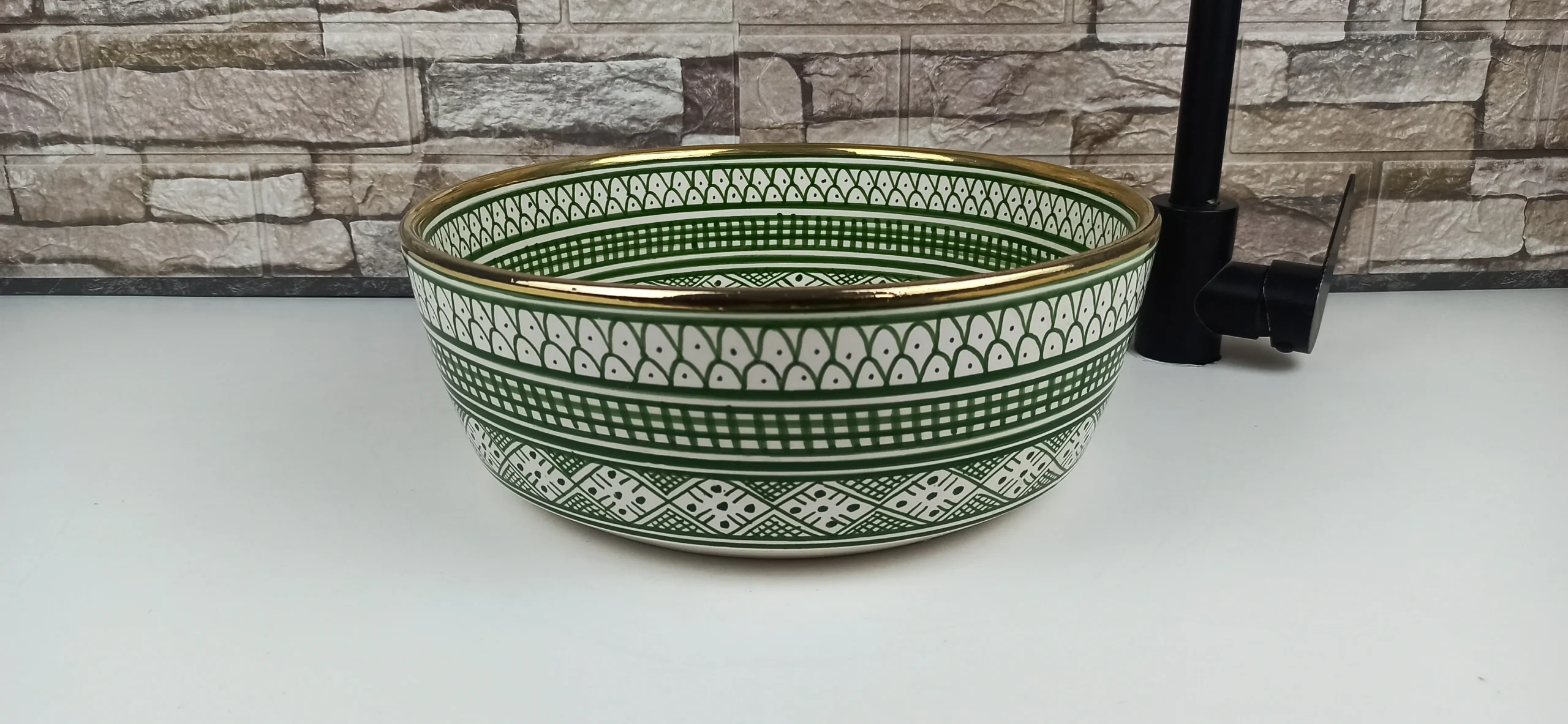 Decorated with a rich green geometric pattern inspired by classic Moroccan zellige motifs, this ceramic sink brings a sense of harmony, freshness, and cultural depth. The subtle gold-accented rim adds a refined touch, enhancing the overall aesthetic while maintaining a handcrafted, organic feel. Its glossy glazed surface ensures durability, easy cleaning, and long-lasting color vibrancy.