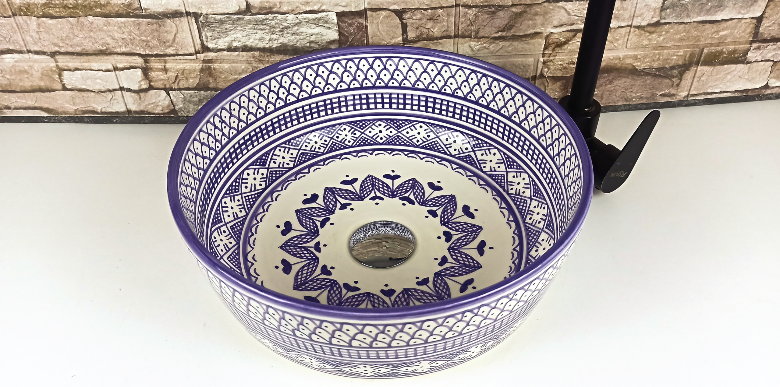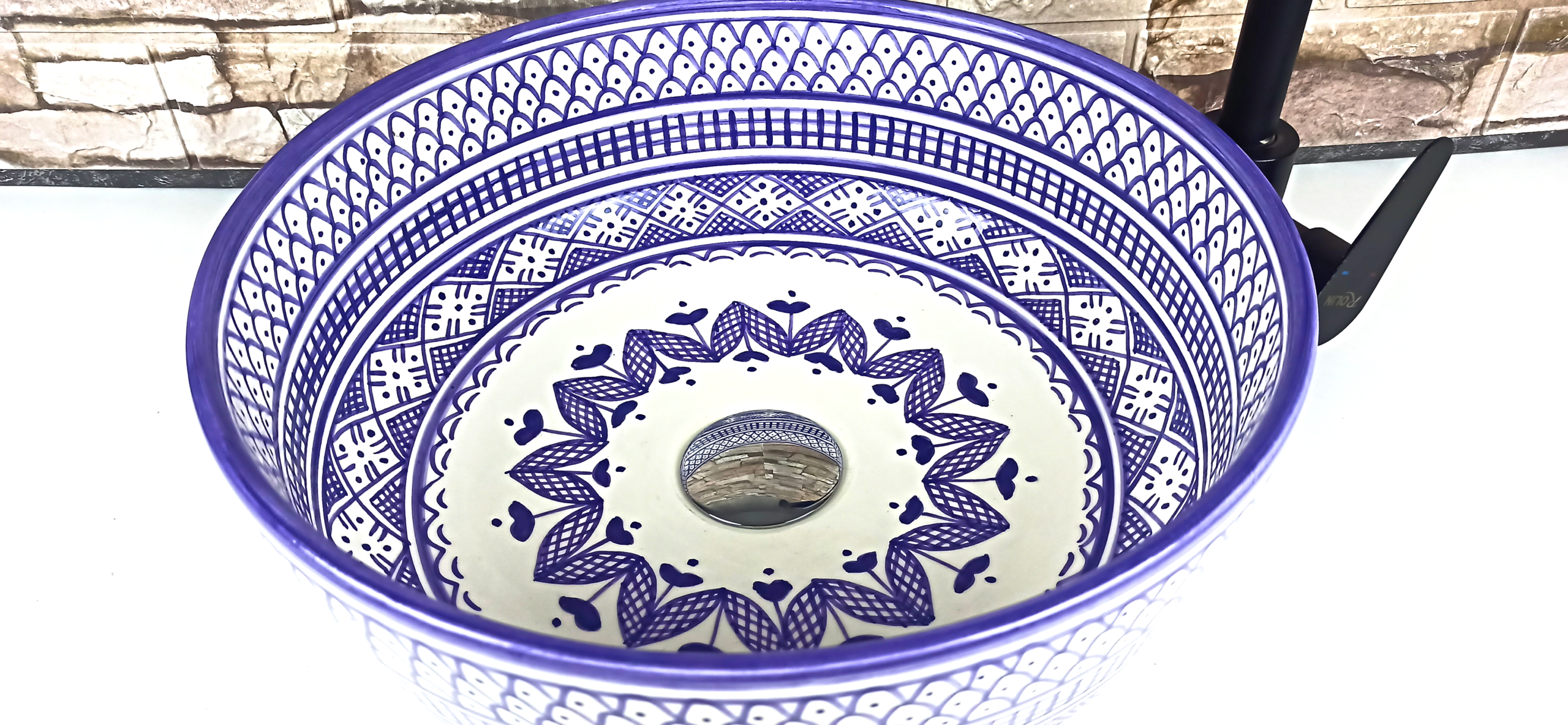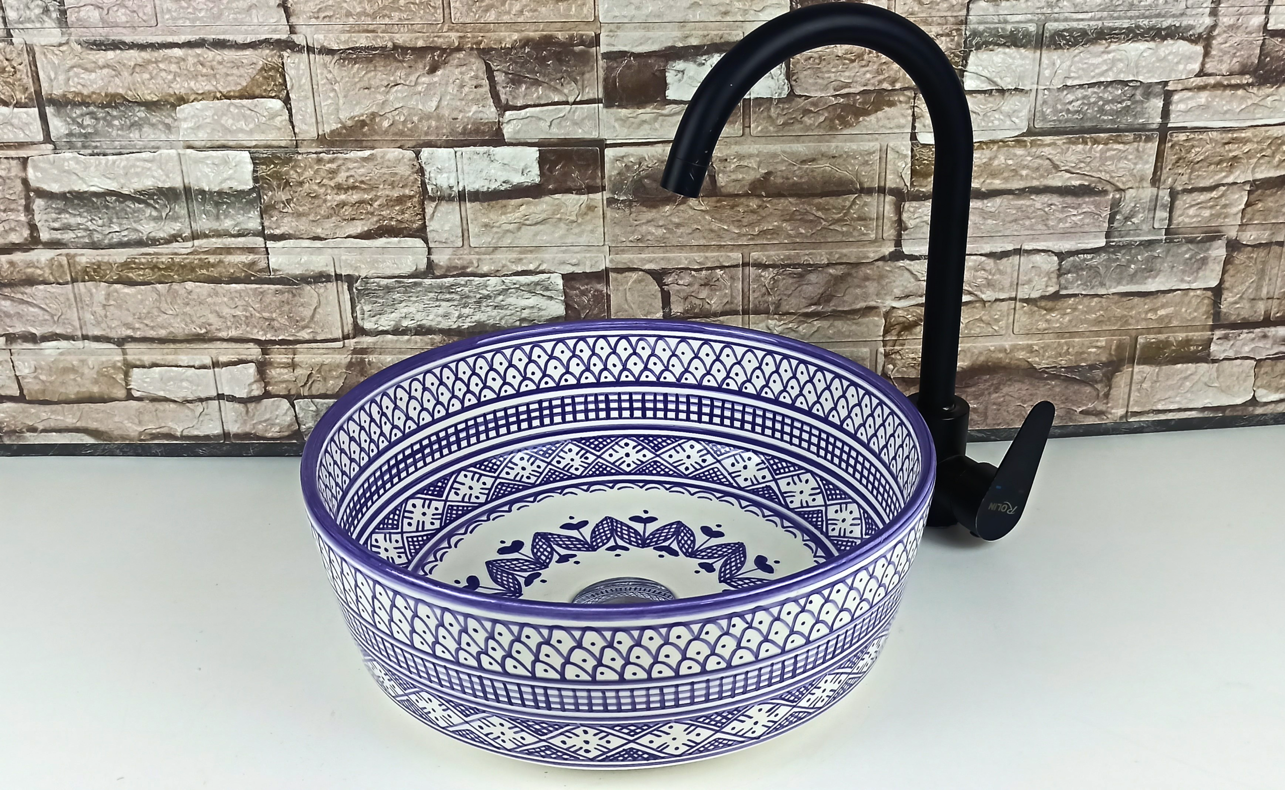 This Moroccan handmade ceramic sink is a unique artisan vessel basin, entirely hand-painted by skilled Moroccan craftsmen. Designed for bathroom or kitchen countertops, it combines traditional Moroccan geometry with a refined, elegant color palette, making it both practical and decorative.