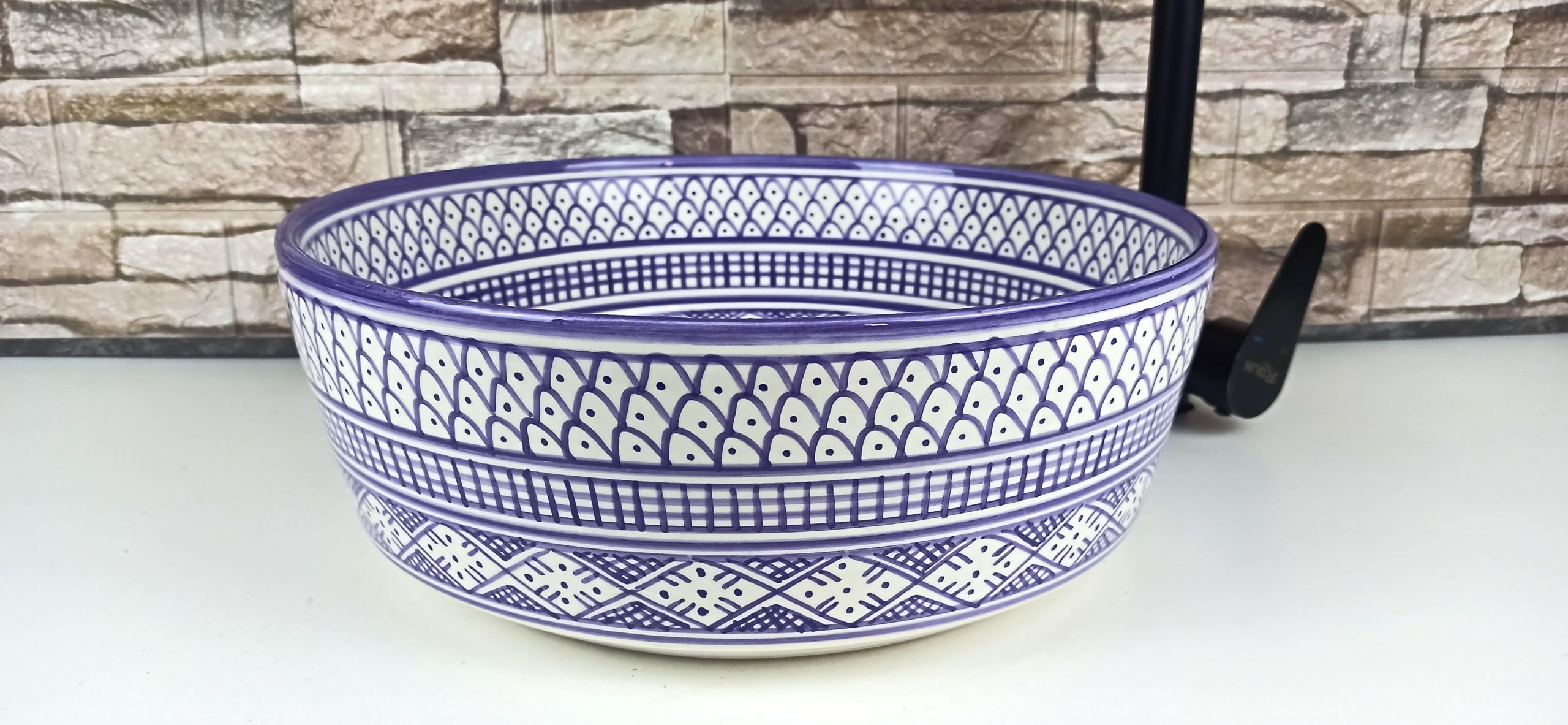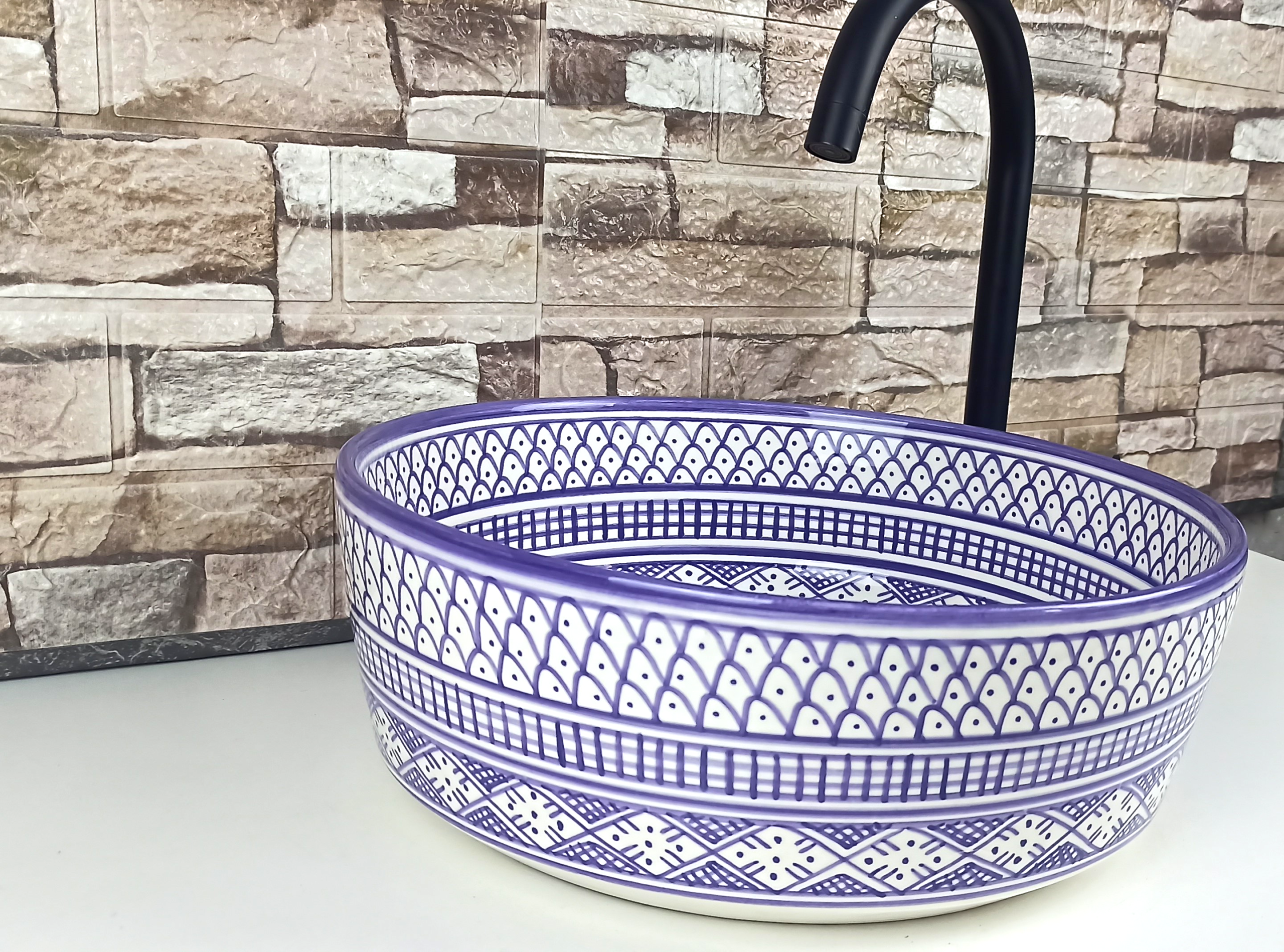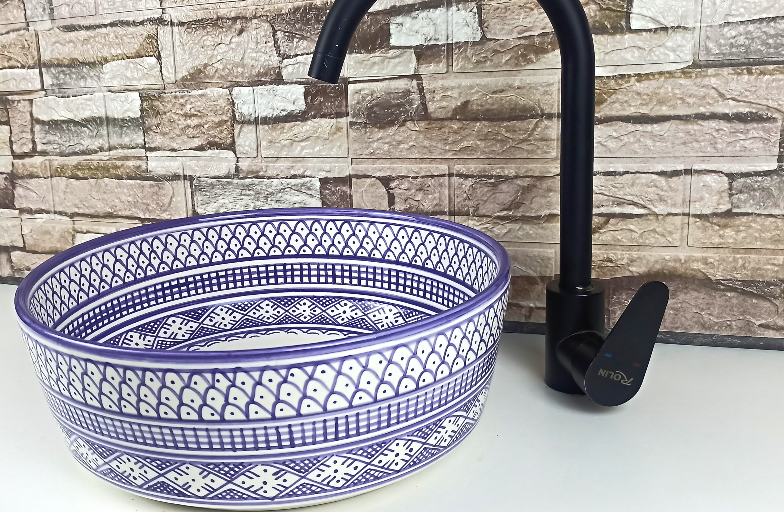 This Moroccan handmade ceramic sink is a unique artisan vessel basin, entirely hand-painted by skilled Moroccan craftsmen. Designed for bathroom or kitchen countertops, it combines traditional Moroccan geometry with a refined, elegant color palette, making it both practical and decorative.
